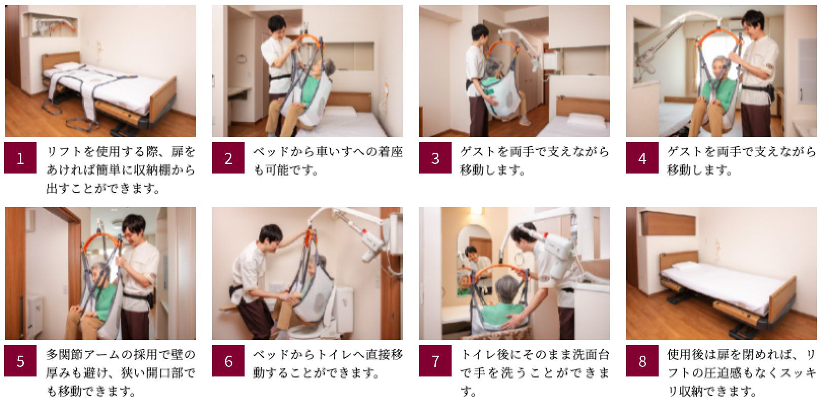 当商品は、部屋の中心にある壁に設けた収納棚に介護リフトを設置し、ベッドからトイレや洗面台までの移動を可能にし、居室内の移動の範囲を広げました。さらに、多関節アームの採用により、リフトを収納する壁に厚みが出ず、狭い開口部でも移動が可能となり、被介護者、介護職員の安全、快適さを実現しました。なお、当商品は実用新案を取得しました。