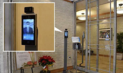 顔認証AIを搭載したサーモカメラを風除室に設置し、入館者の「体温測定」と「顔認証登録・未登録の識別」を実施した上で、自動ドアの開閉制御を行います。併せて、室内にも同仕様のサーモカメラを設置し、お身体の状態により一人での外出が難しいご入居者の単独外出を抑制します。